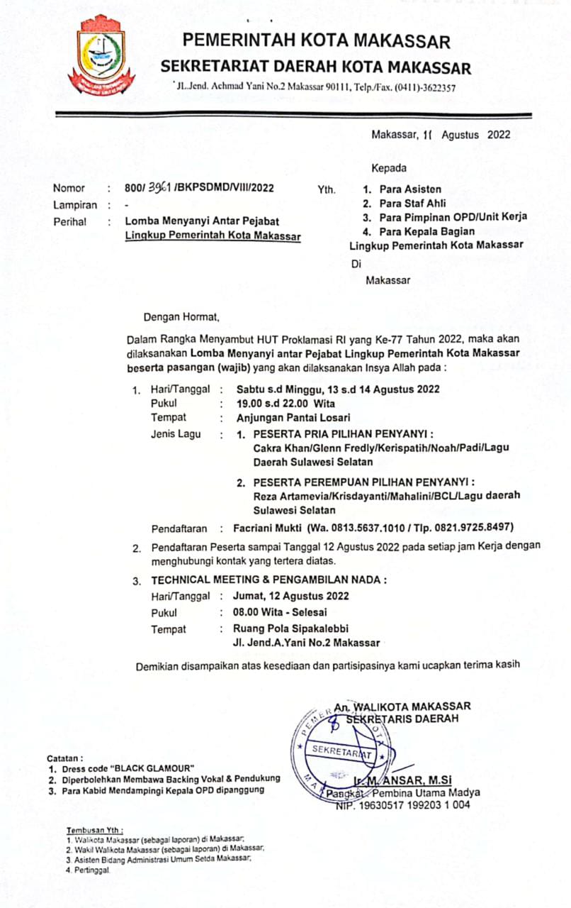 Event lomba nyanyi yang digelar Pemkot Makassar, diselenggarakan dari 13 hingga 14 Agustus dan akan diikuti para asisten, staf ahli, pimpinan OPD dan kepala bagian di lingkup Pemkot Makassar.